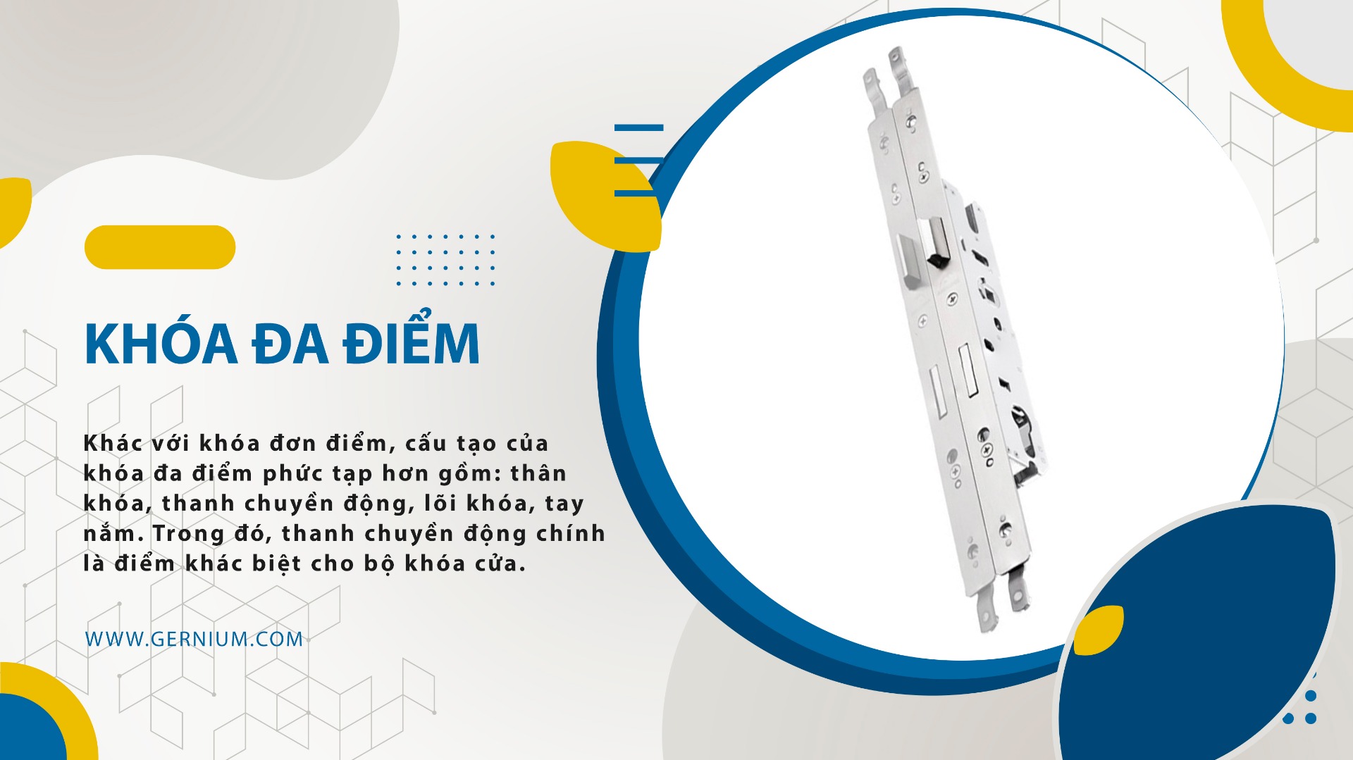 Khác với khóa đơn điểm, cấu tạo của khóa đa điểm phức tạp hơn gồm: thân khóa, thanh chuyền động, lõi khóa, tay nắm. Trong đó, thanh chuyền động chính là điểm khác biệt cho bộ khóa cửa. Thanh chuyền động được liên kết với thân khóa chạy dọc từ trên xuống dưới khung cánh cửa, giúp tăng thêm các điểm gài, khóa ở nhiều vị trí cho khung cửa. Nhờ thanh chuyền động cửa nhôm đảm bảo đảm độ an toàn, kín khít tối đa, đồng thời làm tăng khả năng cách âm, cách nhiệt hiệu quả.