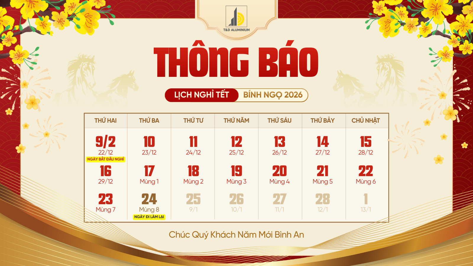 Nhôm Tiến Đạt xin trân trọng thông báo lịch nghỉ Tết Nguyên Đán 2026 như sau: